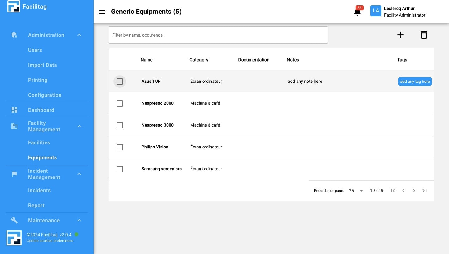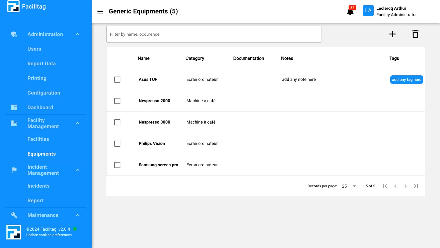 Click this icon to delete a generic equipement