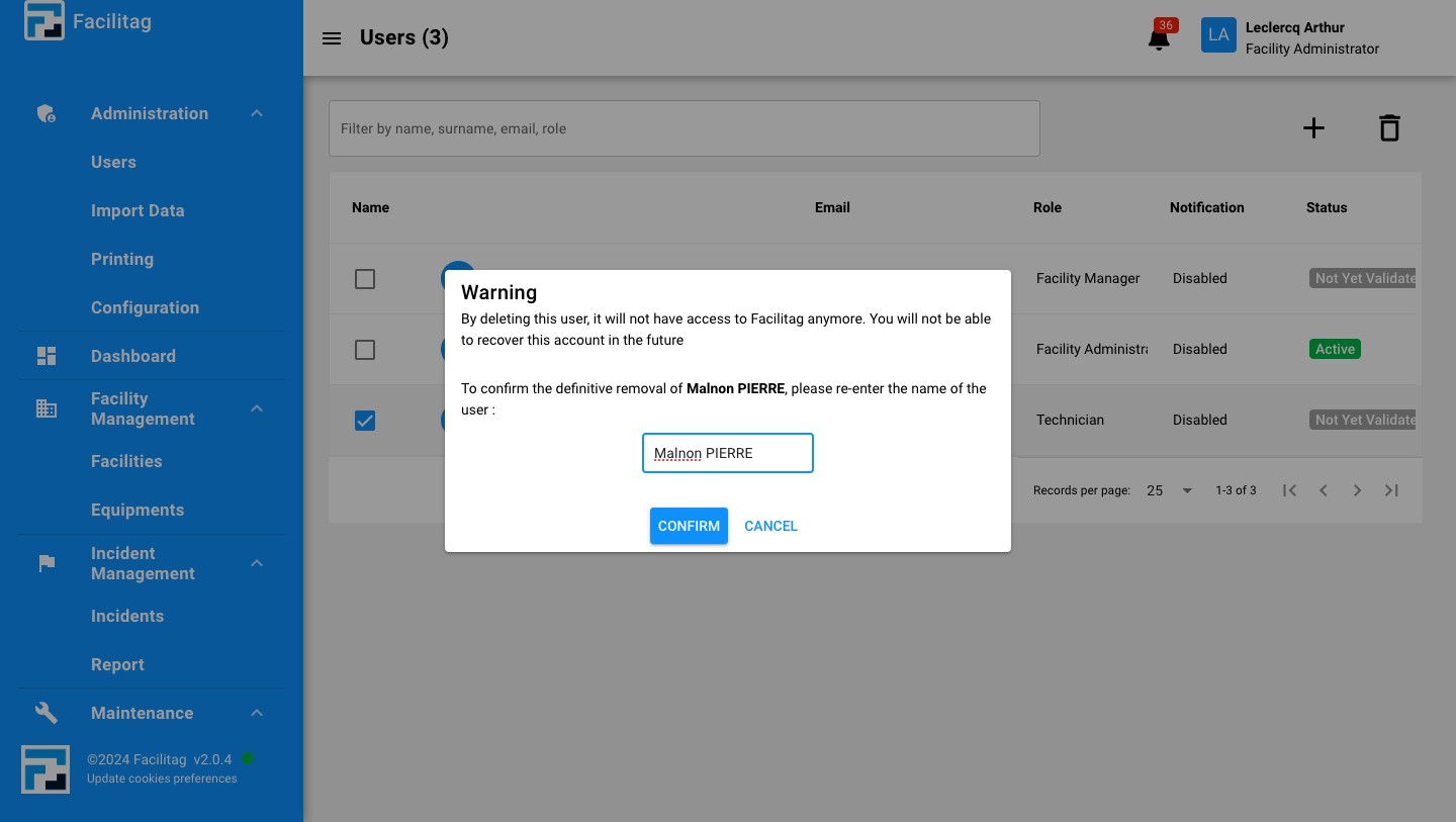 Confirm the Definitive Removal by entering the name of the User
