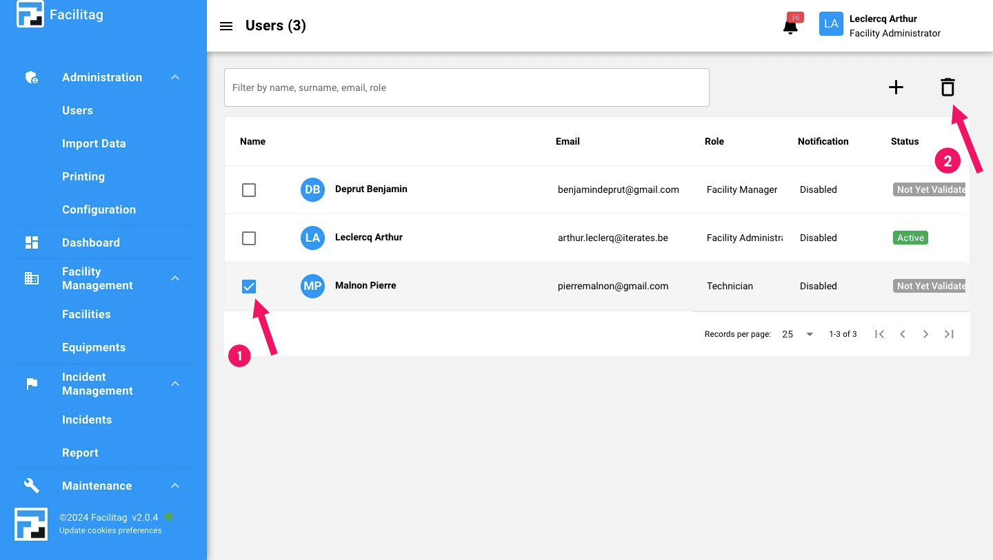 Select a user and click on the "bin" icon